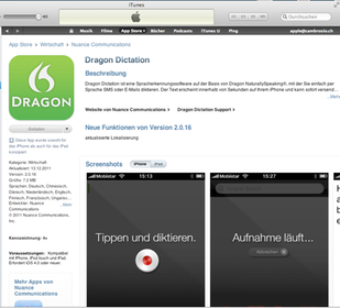 Mit der App “Dragon Dictation” können dem iPhone oder iPad Texte diktiert werden. Die Spracherkennung funktioniert gut. Die diktierten Texte können per Mail verschickt werden. Es steht auch eine Kopierfunktion zu Verfügung. So können die Texte in andere Apps eingefügt werden.