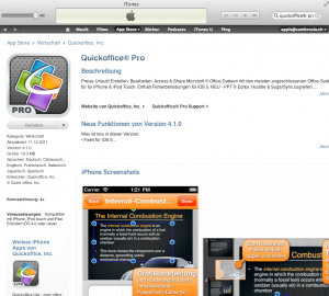 Die App “QuickofficePro” ermöglicht es, Textdokumente im Word-Format (Excel und Powerpoint sind ebenfalls möglich) zu erstellen. In diese Worddateien kann der Text aus “Dragon Dictation” eingefügt werden. In “QuickofficePro” können Dateien auf dem iPhone/iPad dirket gespeichert werden oder in die Dropbox oder andere Cloud-Dienste übertragen werden.